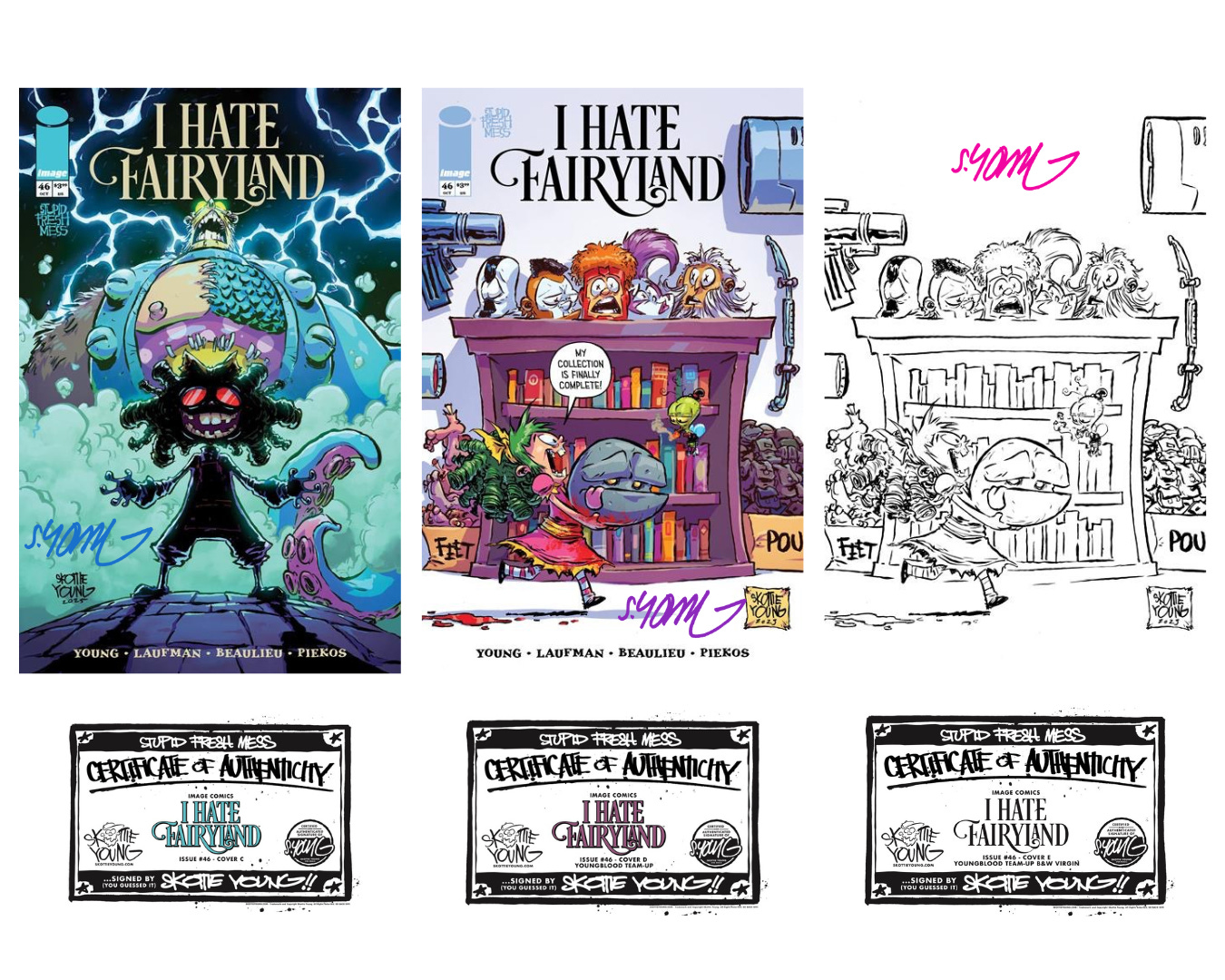 Hi, Megan here with some fun Skottie Shop news! YES… we are indeed having a Black Friday sale to get some holiday cheer cooking. But FIRST, we dropped signed sets of Skottie’s THREE covers for I Hate Fairyland #46!