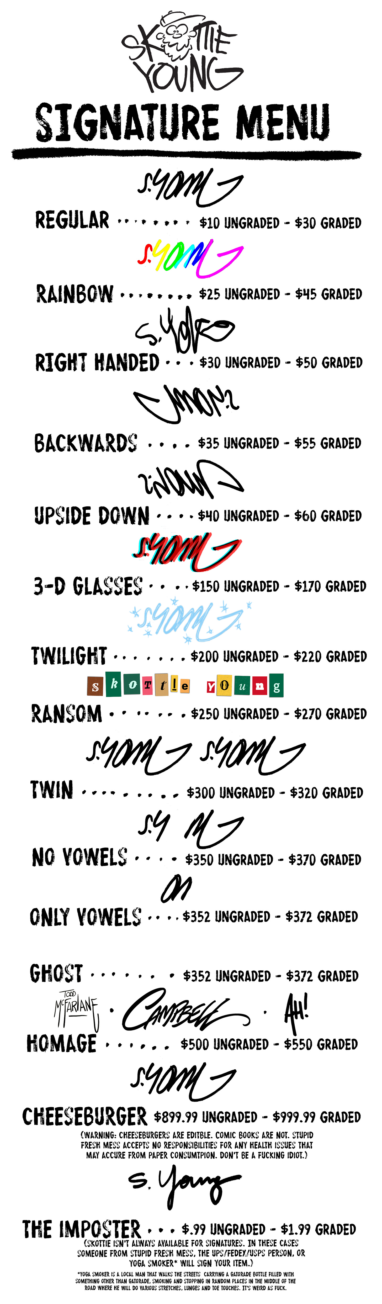 One of the single most frequent questions I’m asked is, will Skottie sign my book with his old graffiti signature or with his original art signature or this way or that way. I finally have a NEW answer to that question. YES! Introducing our Skottie Signature Menu! It took some convincing but Skottie is totally on board now. There is a signature for everyone, and every book, on this menu. These will be offered in The Skottie Shop and at conventions. Let us know in the comments which your favorite is!