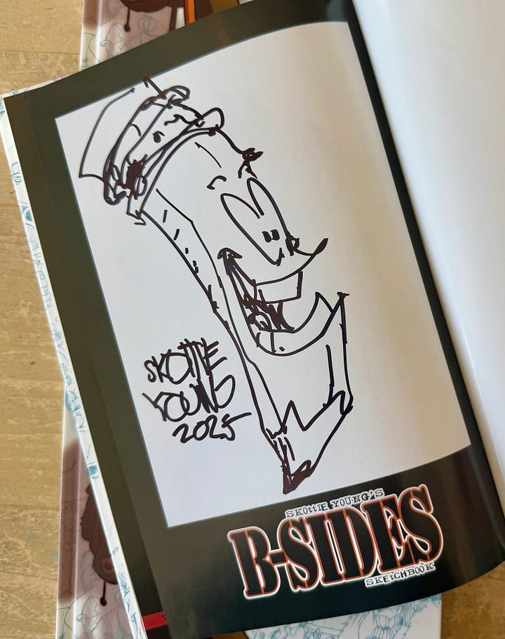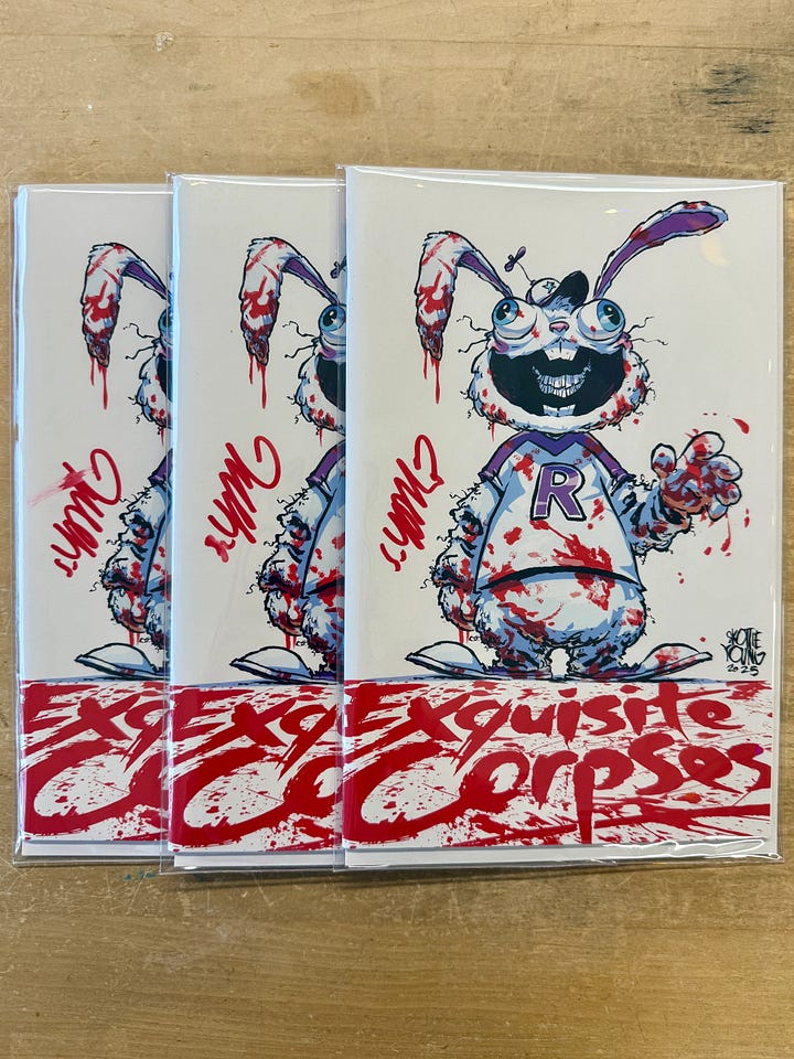 One of the questions we often hear is where did this inventory come from if it was sold out previously? It’s a combination of things and it depends on the book. We always hold back a small percentage of copies to cover any damages in shipping or other mishaps. Sometimes we hold copies for Skottie to remark/sketch on (and then sometimes he doesn’t listen to me and sketch on them). Some of these books didn’t pass our inspection for the initial drop but we held onto them. In the case of Absolute Batman- it was dropped on October 3, 2024 and available at regular price for months. In early-ish 2025 we took down remaining inventory to travel to conventions with after our sales had slowed. We are now making that inventory available if you weren’t around for the 1st drop or were late to finding Absolute Batman!