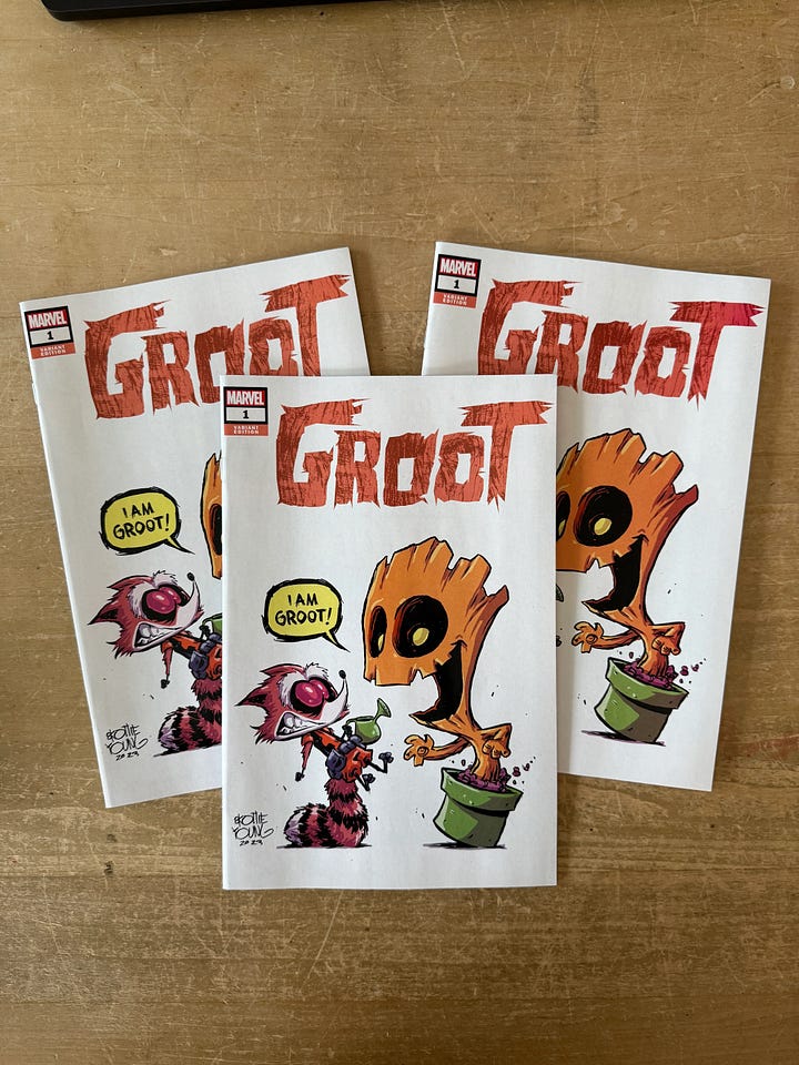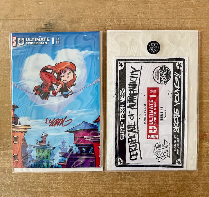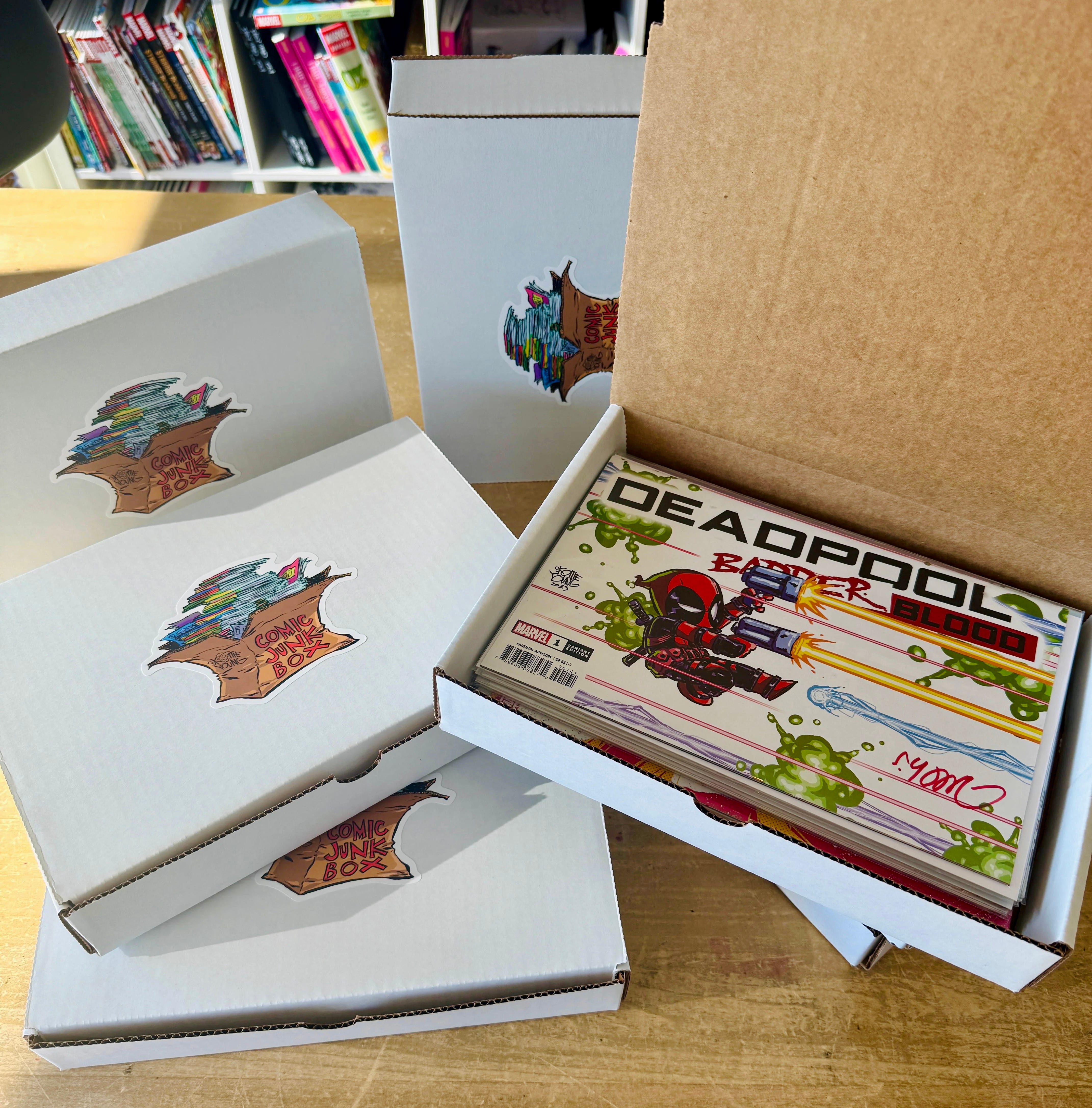 And finally, our COMIC JUNK BOXES (aka Mystery Boxes). These boxes include 10 comics- 9 are raw and 1 will be signed. They come in a box with a sticker Skottie made just for the occasion. Limit of ONE BOX.