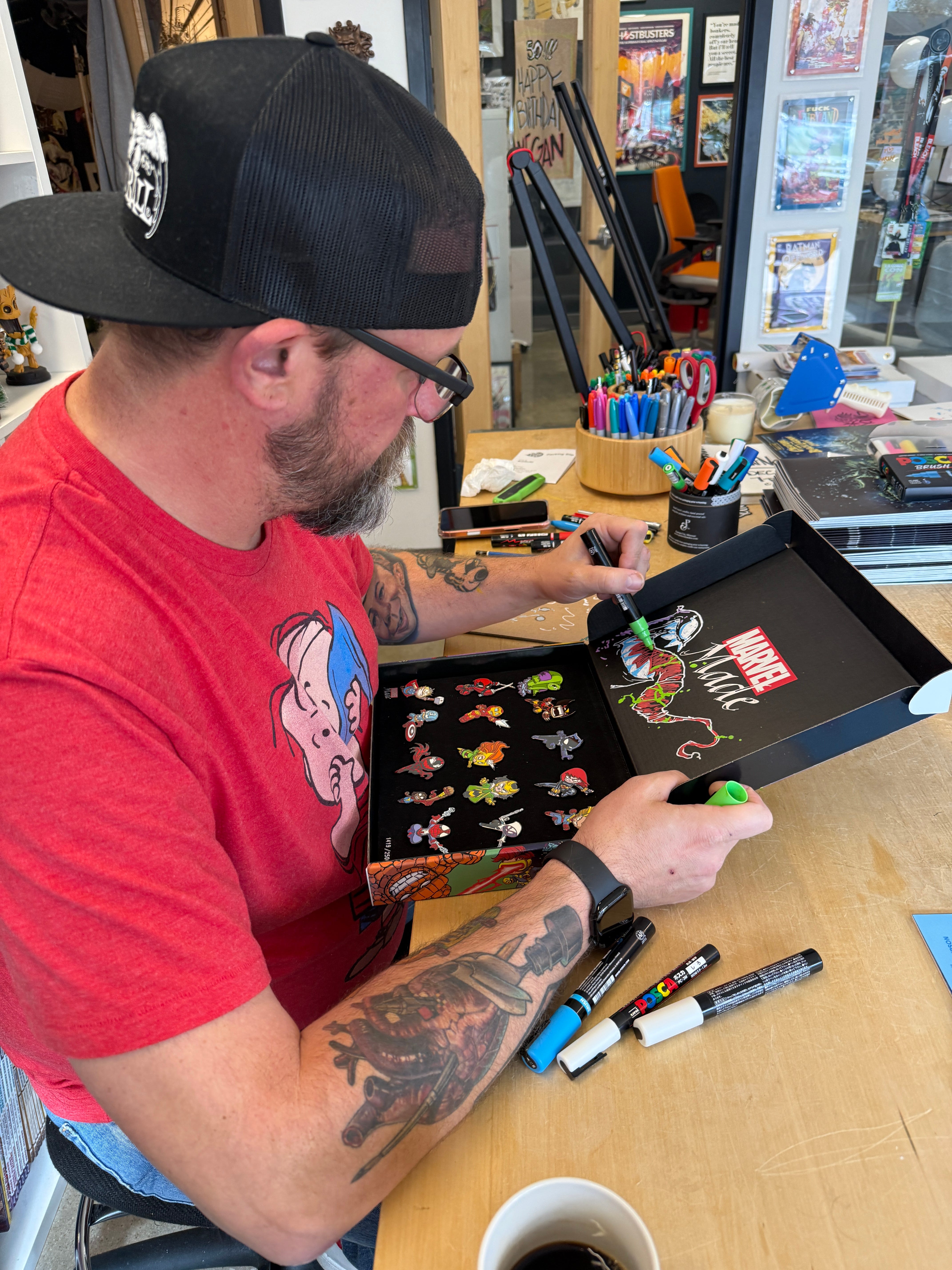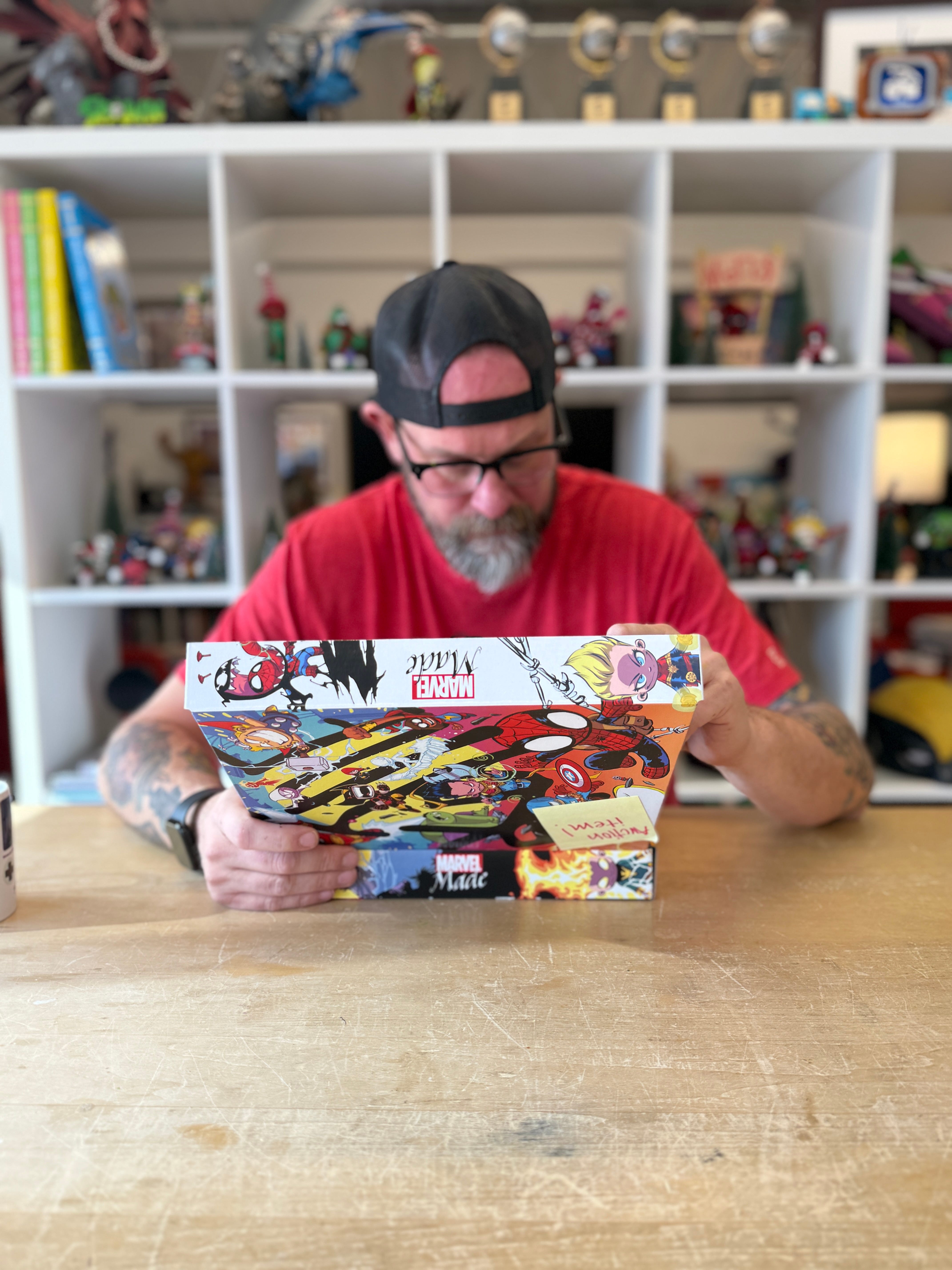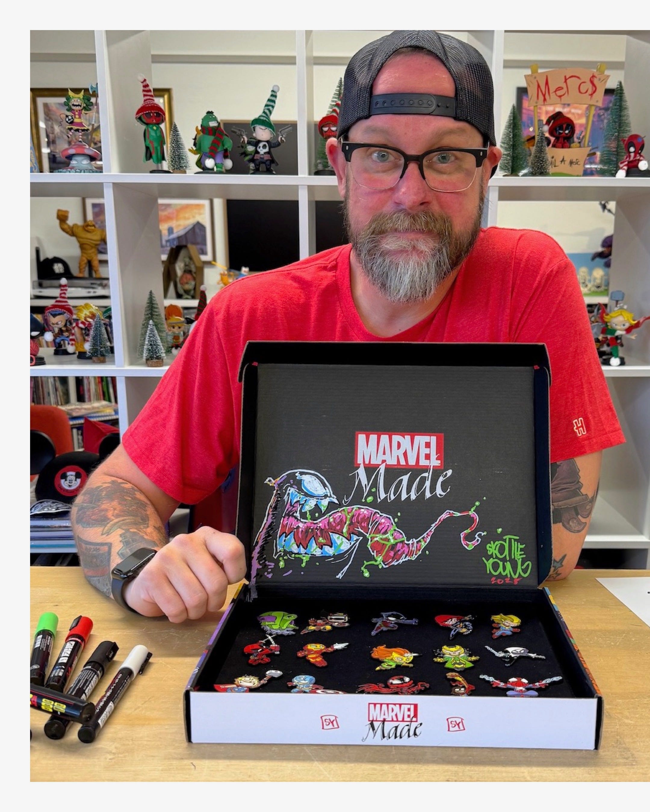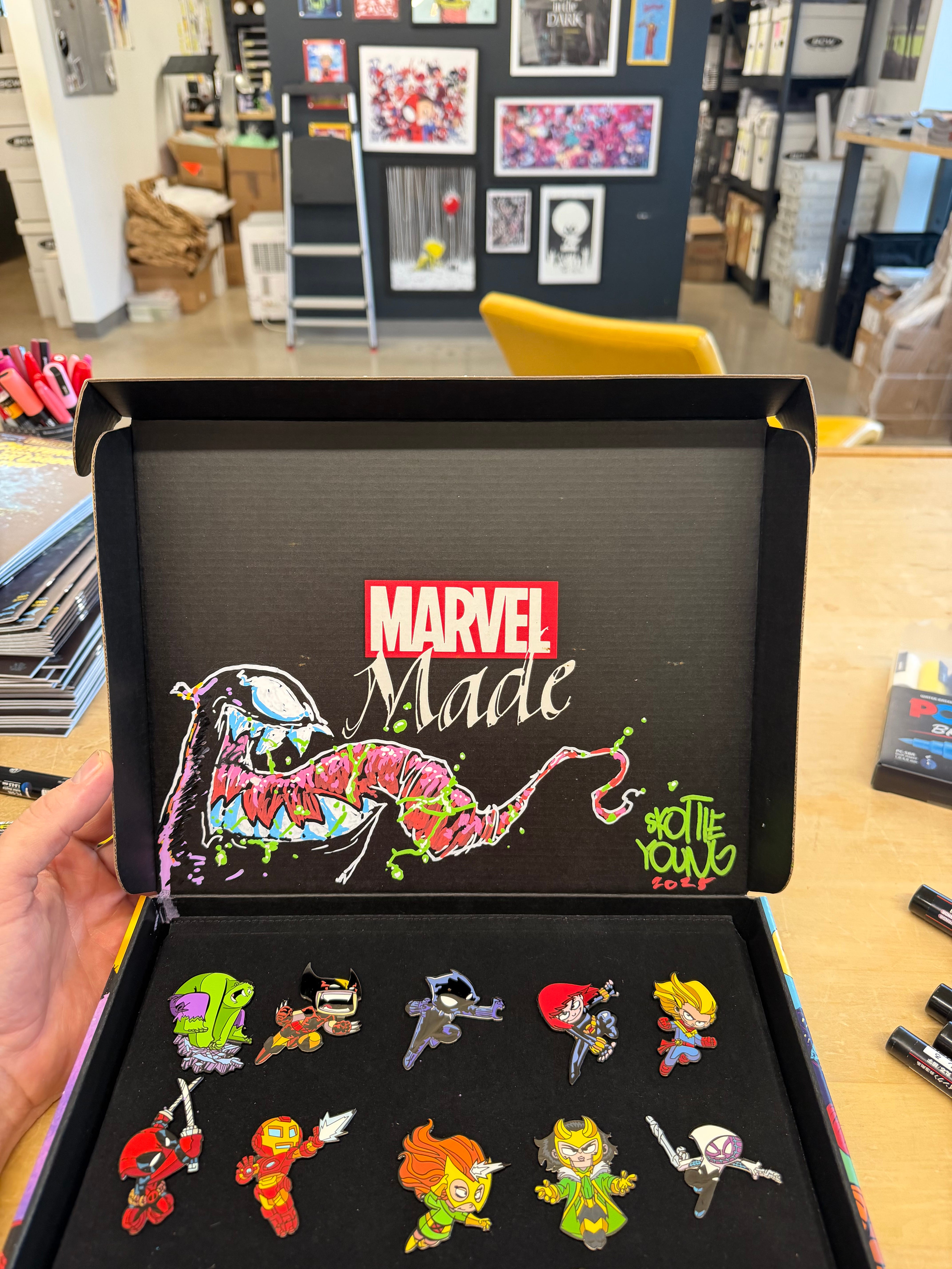 Next up, we have a really cool auction going on at SkottieYoung.com right now. Back in 2019 Marvel did a direct to consumer drop called Marvel Made and the first one was all me baby! It was an exclusive enamel pin set, a journal, a few exclusive comics and packaged in a full blown Skottie Young art box! We have a few laying around the studio and Megan NOT SO SUBTLY leaves one of the boxes out on the main studio desk next to 30 or 40 Pocsa paint markers and is all like “If you feel like drawing on this, you can.” So I did and now it’s up for auction at my site!